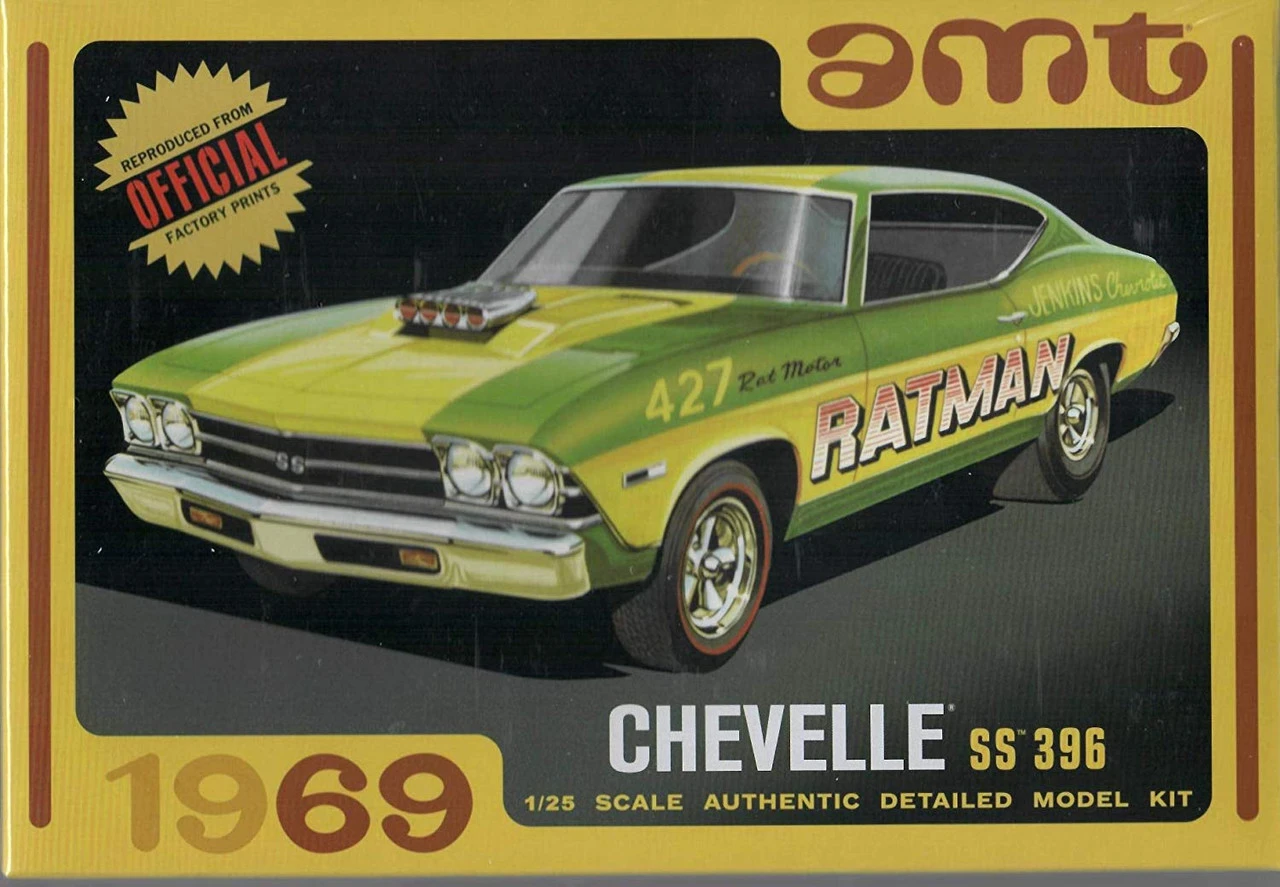 1/25 Scale, Build Street, Drag, or Custom, Pad-Printed Firestone Drag 500 Slicks & Tires, Wheelie Casters, Drag Bucket Seat, Custom Front and Rear Ends, Rally and American Mag Wheels, 396 cu. in. Engine w/Chrome Injection, “Stinger” Custom Exhaust Outlet